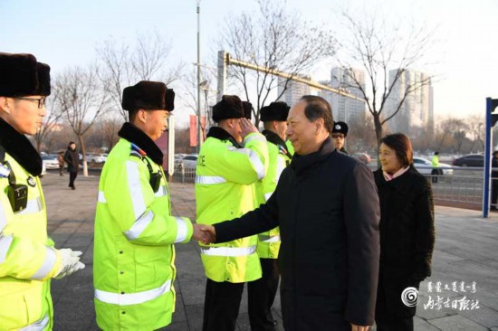 首府街頭,年味濃郁,處處洋溢著歡樂祥和的節(jié)日氣氛。石泰峰、布小林來到新華大街和東二環(huán)交匯口的交警執(zhí)勤崗?fù)ぃH切慰問呼市交警支隊新城大隊九中隊的執(zhí)勤交警。“同志們好!今天是除夕,在萬家團圓的時候你們還在值守,大家辛苦了。我和布小林主席代表自治區(qū)黨委和政府給大家拜年了,祝你們春節(jié)快樂、闔家幸福。”石泰峰、布小林與大家一一握手,詢問節(jié)日期間執(zhí)勤情況,希望他們做好各項工作,讓人民群眾過一個平平安安、歡樂祥和的春節(jié)。
