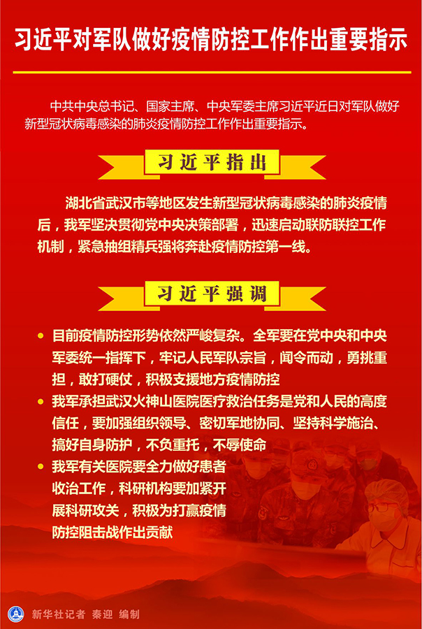 習(xí)近平強調(diào),目前疫情防控形勢依然嚴(yán)峻復(fù)雜。全軍要在黨中央和中央軍委統(tǒng)一指揮下,牢記人民軍隊宗旨,聞令而動,勇挑重?fù)?dān),敢打硬仗,積極支援地方疫情防控。我軍承擔(dān)武漢火神山醫(yī)院醫(yī)療救治任務(wù)是黨和人民的高度信任,要加強組織領(lǐng)導(dǎo)、密切軍地協(xié)同、堅持科學(xué)施治、搞好自身防護(hù),不負(fù)重托,不辱使命。我軍有關(guān)醫(yī)院要全力做好患者收治工作,科研機構(gòu)要加緊開展科研攻關(guān),積極為打贏疫情防控阻擊戰(zhàn)作出貢獻(xiàn)。