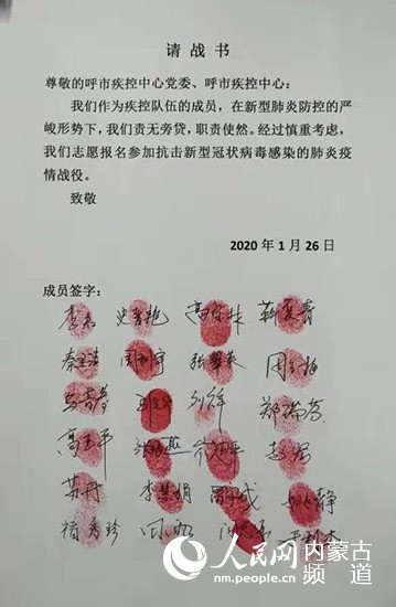 1月26日,1000封按滿紅手印的請戰(zhàn)書“刷屏”了。“在全國上下齊心協(xié)力共同抗擊新型冠狀病毒感染的肺炎疫情之際,請各位主任統(tǒng)計(jì)匯總本科室主動(dòng)申請隨時(shí)去抗疫前線的醫(yī)師,并將自愿報(bào)名的名單發(fā)至本群。”呼和浩特市第一醫(yī)院普外科主任醫(yī)師烏云塔娜把“請戰(zhàn)”信息發(fā)到微信群后,手機(jī)就一直響個(gè)不停。不到一天,呼和浩特市第一醫(yī)院主動(dòng)“請戰(zhàn)”的醫(yī)護(hù)人員就達(dá)到200多人。