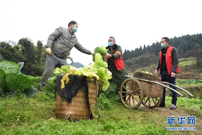2月8日,菜農(nóng)(左)和鄉(xiāng)村蔬菜配送小隊志愿者在搬運蔬菜。 新華社記者 唐奕 攝