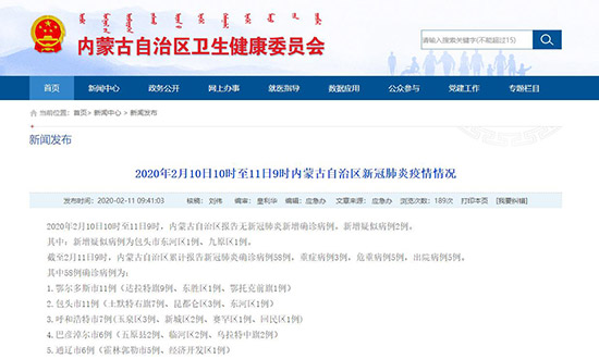 2月11日,記者從內(nèi)蒙古自治區(qū)衛(wèi)生健康委員會(huì)獲悉,2020年2月10日10時(shí)至11日9時(shí),內(nèi)蒙古自治區(qū)報(bào)告無新冠肺炎新增確診病例。新增疑似病例2例。