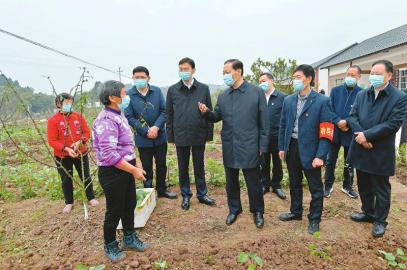 春回大地,正是春耕好時節(jié)。黎明村村民搶抓農(nóng)時,有的在翻耕土地,有的正給田間作物澆水施肥,有的在播種早春玉米,一片忙碌景象。彭清華走進村口的花椒基地,與套種茄子秧苗的村民親切交談,詢問栽種面積、土壤墑情、生長周期、市場銷路等情況。他說,一年之計在于春,切實抓好春耕生產(chǎn)對于實現(xiàn)全年豐產(chǎn)豐收意義重大。農(nóng)時不等人,要在嚴格落實防控措施的同時,及時推進春季農(nóng)業(yè)生產(chǎn)和生豬恢復生產(chǎn),因地制宜調(diào)整種養(yǎng)業(yè)結構,確保穩(wěn)產(chǎn)保供和農(nóng)民持續(xù)增收。有關部門要繼續(xù)做好服務保障,加強技術指導,強化農(nóng)資儲備、調(diào)劑和配送,搞好產(chǎn)銷銜接,讓生產(chǎn)資料進得來、農(nóng)產(chǎn)品賣得出。對隔離觀察群眾要做好生產(chǎn)扶持工作,幫助他們克服困難、不誤農(nóng)時。