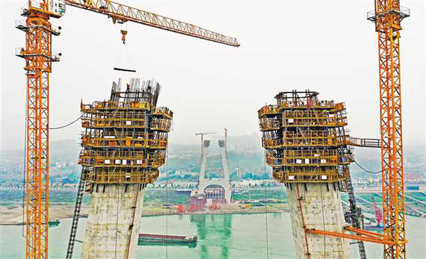 二月二十六日上午,連接巴南和大渡口的重慶白居寺長江大橋正式復工,建橋工人在幾十米高的南岸橋塔上扎鋼筋。特約攝影 鐘志兵