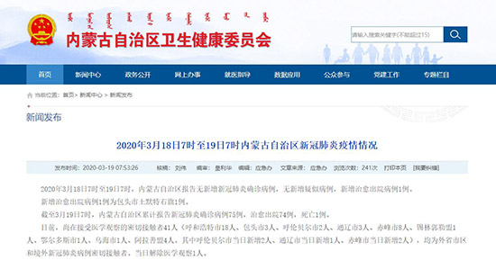 截至3月19日7時,內(nèi)蒙古自治區(qū)累計報告新冠肺炎確診病例75例,治愈出院74例,死亡1例。