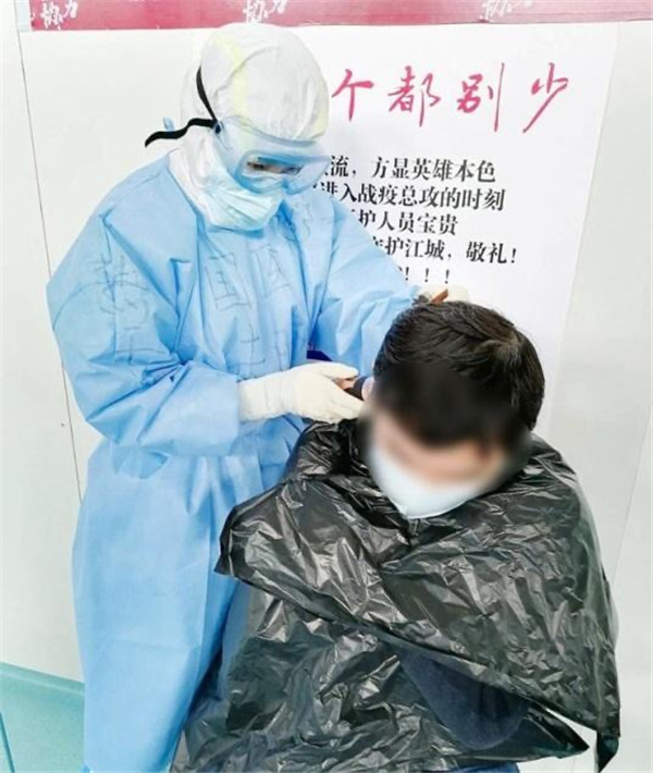 1艙有康復(fù)人員想理發(fā),手頭沒有工具,朱晴護士長得知后,聯(lián)系下個班次護士帶來推子,給大家理發(fā)。“看你動作很嫻熟啊,以前練過的吧”,“圍觀群眾”打趣道。“現(xiàn)學(xué)現(xiàn)賣,大家要求不要太高,有壓力?。?rdquo;朱晴說。一直推到推子沒電,朱晴給6位康復(fù)人員簡單修剪了頭發(fā)。得知朱晴是西安醫(yī)療隊的護士,大家都親切的稱她“肉夾饃”!