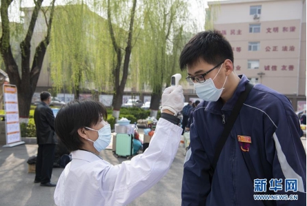 3月25日,在位于太原市財(cái)貿(mào)學(xué)校的太原市第五十三中學(xué)校高三教學(xué)點(diǎn),學(xué)生接受體溫測(cè)量。
