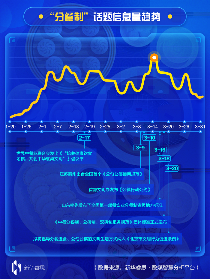根據(jù)新華睿思·數(shù)媒智慧分析平臺(tái)數(shù)據(jù)顯示,在最近兩個(gè)月來(lái),關(guān)于分餐制話(huà)題的關(guān)注度不斷上升,全國(guó)范圍內(nèi)信息量累計(jì)達(dá)到1039539條。其中,從話(huà)題趨勢(shì)演變圖看,3月14日達(dá)到輿論熱度的首個(gè)峰值(30183條),這與北京、江蘇泰州等地發(fā)布出臺(tái)關(guān)于公筷使用的文件直接相關(guān)。
