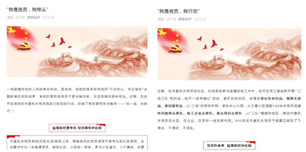 2月20日,經(jīng)開區(qū)通過微信公眾號、新浪微博策劃制作《我是黨員,我?guī)ь^》《我是黨員,我行動》系列網(wǎng)絡(luò)稿件,刊播下沉社區(qū)一線的黨員干部事跡10期,以小見大,充分展現(xiàn)基層黨組織和黨員干部勇當(dāng)先鋒、敢打先陣的帶頭作用。