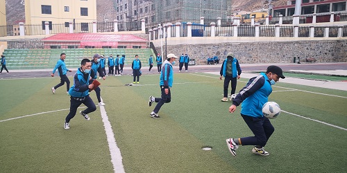 玉樹州民族中學(xué)學(xué)生在操場(chǎng)踢足球。 楊陽攝