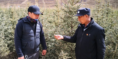 林業(yè)人員在高原千畝林木良種繁育實(shí)驗(yàn)基地查看樹苗情況。 楊陽攝