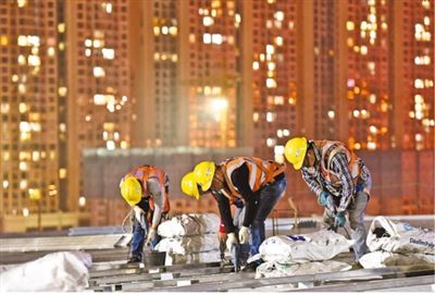 近日,在廣西柳州柳東新區(qū)國際會展中心三期項目工地,夜班工人在屋面作業(yè)。 黎寒池攝(影像中國)