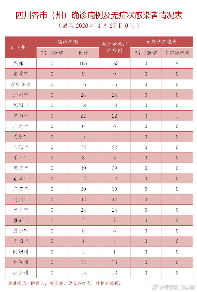 記者從四川省衛(wèi)健委獲悉,4月26日0-24時(shí),四川無(wú)新增新型冠狀病毒肺炎確診病例,無(wú)新增疑似病例,157人尚在接受醫(yī)學(xué)觀察。