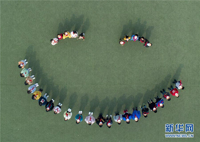 5月8日,江蘇省泰州市大馮中心小學(xué)學(xué)生在操場上拼出笑臉圖案(無人機照片)。 當(dāng)日是世界微笑日。 新華社發(fā)(湯德宏 攝)