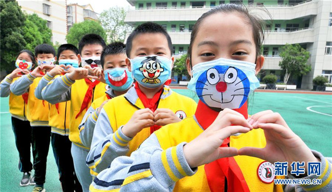 5月8日,安徽省安慶市迎江區(qū)華中路第二小學(xué)在操場上開展手繪“微笑口罩”創(chuàng)意活動,通過讓孩子們手繪各式笑臉并貼到口罩上的方式,引導(dǎo)學(xué)生培養(yǎng)健康樂觀的心態(tài)。 當(dāng)日是世界微笑日。 新華社發(fā)(黃有安 攝)