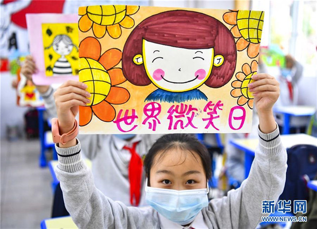 5月8日,江蘇省揚州市竹西小學(xué)的學(xué)生們手持笑臉卡片參加活動。 當(dāng)日是世界微笑日。 新華社發(fā)(孟德龍 攝)