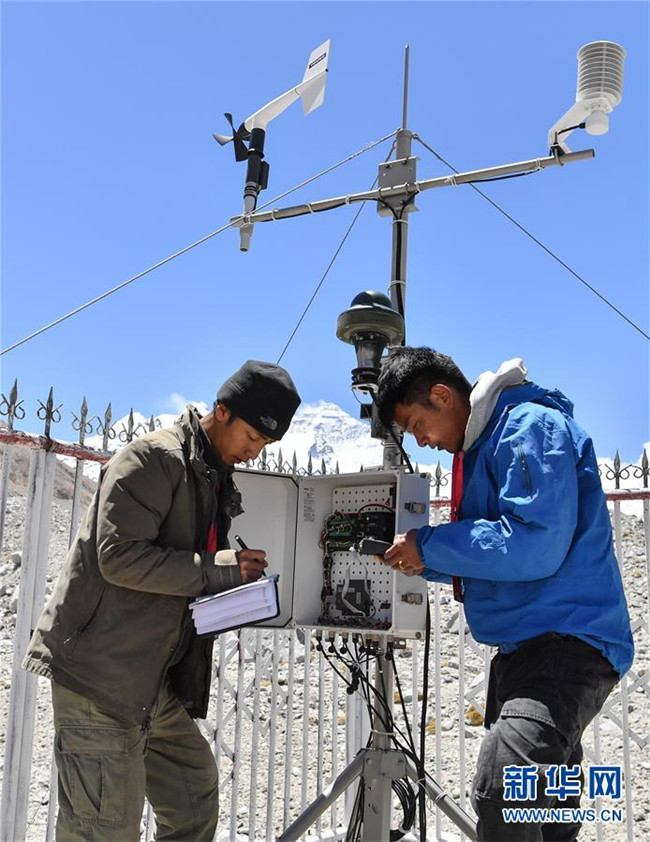 西藏自治區(qū)氣象局工作人員在珠峰大本營自動(dòng)氣象站記錄氣象數(shù)據(jù)(5月10日攝)。新華社記者 普布扎西 攝