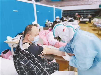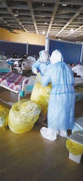 對于護(hù)理醫(yī)療隊的隊員們來說,在洪山體育館武昌方艙醫(yī)院的每一天,都是那么緊張。護(hù)理人員需快速對新入院的患者實施入院流程管理,觀察病情、監(jiān)測病人生命體征,及時將不適合入院的患者分診出轉(zhuǎn)至定點醫(yī)院;在為患者做好血氧監(jiān)測、體溫監(jiān)測等??谱o(hù)理的同時,還包攬了喂飯、喂藥、翻身、擦洗、換衣、大小便管理等各種貼身護(hù)理工作。這些看起來簡單的工作,卻因為要在防護(hù)服、口罩、護(hù)目鏡等防護(hù)裝備的層層包裹下進(jìn)行,變得異常吃力。最忙的時候,3個護(hù)士要同時護(hù)理82名患者,但隊員們憑著自身過硬的護(hù)理經(jīng)驗,攻克了一個又一個難關(guān)。