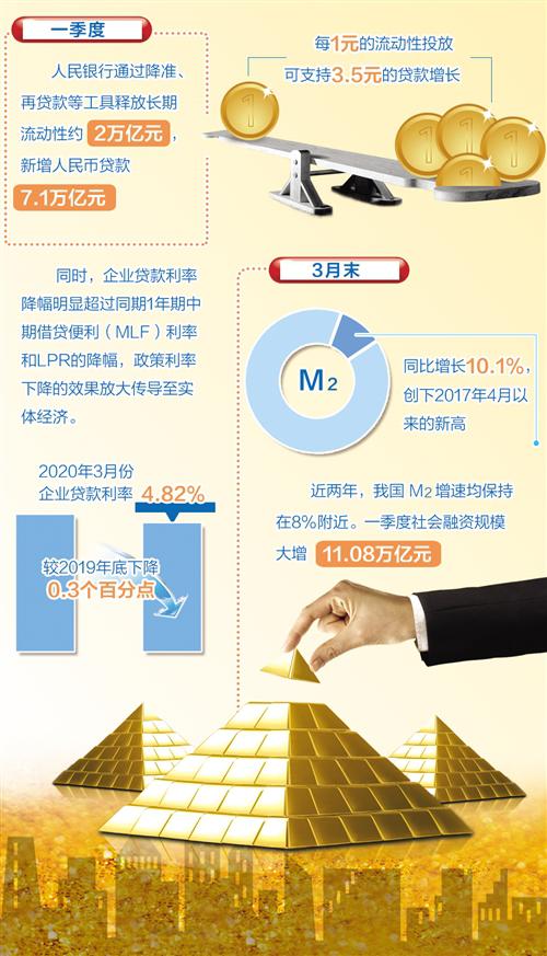 從引導(dǎo)貸款投放看,一季度中國人民銀行通過降準(zhǔn)、再貸款等工具釋放長期流動性約2萬億元,新增人民幣貸款7.1萬億元,每1元的流動性投放可支持3.5元的貸款增長,是1∶3.5的倍數(shù)放大效應(yīng)。