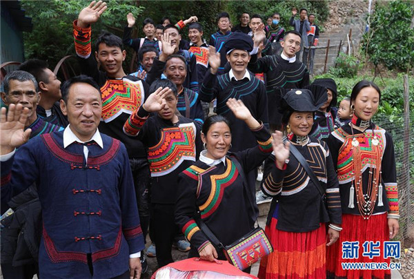 5月12日,四川省昭覺縣阿土列爾村第一批26戶貧困戶坐上開往昭覺縣易地扶貧搬遷縣城集中安置點(diǎn)的新家,與其他村民道別。新華社記者江宏景攝