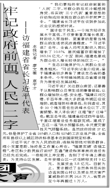 “我們要始終牢記政府前面的‘人民’二字,對群眾的悲歡冷暖感同身受。”2002年3月4日,人民日報兩會特刊的“代表團之聲”欄目里,刊發(fā)了對時任福建省省長的習(xí)近平代表的采訪,標(biāo)題是《牢記政府前面“人民”二字》。