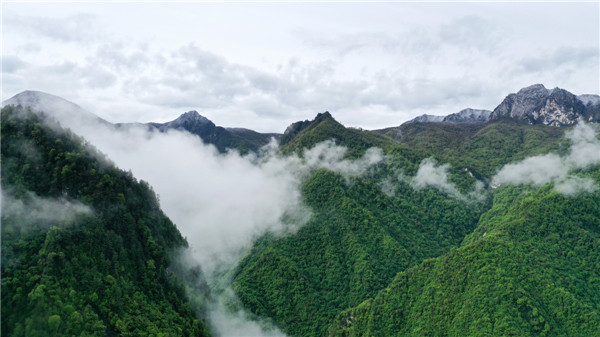 這是5月27日拍攝的雨后云霧繚繞的岷山(無人機(jī)照片)。