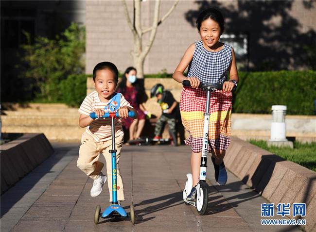 5月31日,在北京市海淀區(qū)中關(guān)村街道新科祥園社區(qū)廣場,小朋友們在玩耍。新華社記者 任超 攝