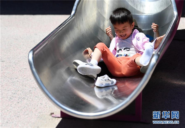 5月31日,小朋友在北京五棵松華熙Live滑滑梯。新華社記者 張晨霖 攝