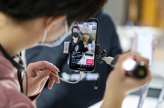 在鄭州市一家商場,售貨員利用網(wǎng)絡(luò)直播平臺介紹手機(jī)商品。新華社供圖