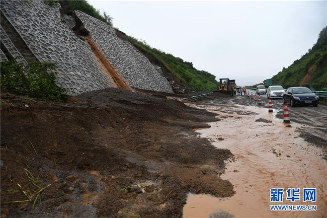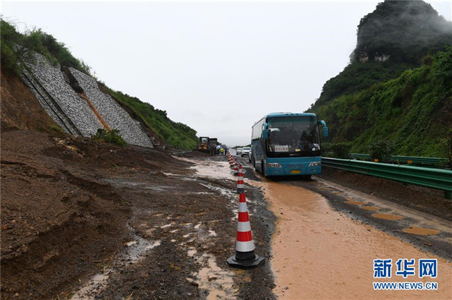 6月7日,在廣西鹿寨至陽(yáng)朔的高速公路上,車(chē)輛從一處發(fā)生滑坡的路段經(jīng)過(guò)。新華社記者 陸波岸 攝