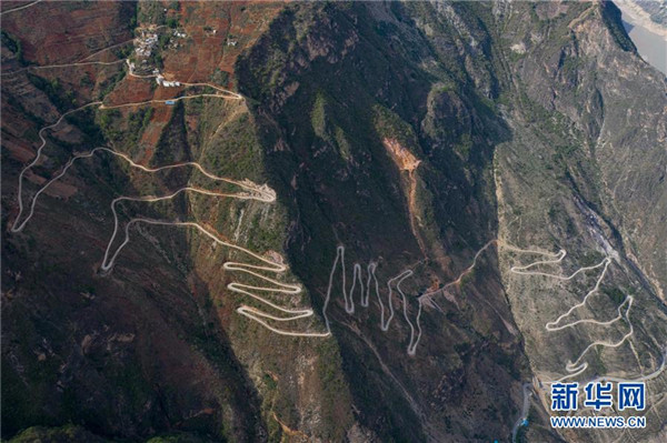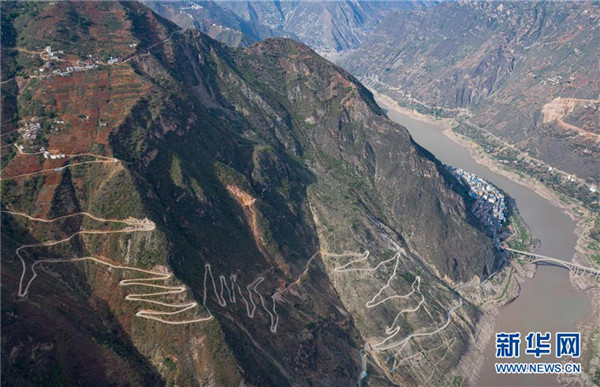 金陽縣蘆稿鎮(zhèn)大灣子村12公里左右的通村公路,28個彎蜿蜒盤旋在金沙江峽谷懸崖絕壁邊(6月7日攝,無人機照片)。坐落在金沙江畔的四川省金陽縣是國家級深度貧困縣,境內(nèi)群山連綿起伏,海拔落差大,眾多村寨處于高山或者高半山上,道路施工難度大。近年來,當?shù)卣畬⒔煌ㄗ鳛槊撠毠缘南葘怨こ?,路越修越寬、越修越好,成為當?shù)厝罕姷拿撠氈赂宦贰=刂?019年底,金陽縣實現(xiàn)所有鄉(xiāng)鎮(zhèn)通油路、建制村通硬化路,鄉(xiāng)道里程達329.9公里,村道里程達866.8公里。新華社記者江宏景攝