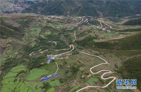 金陽縣天地壩鎮(zhèn)通往吉史里口村易地扶貧搬遷集中安置點的道路(6月7日攝,無人機照片)。坐落在金沙江畔的四川省金陽縣是國家級深度貧困縣,境內(nèi)群山連綿起伏,海拔落差大,眾多村寨處于高山或者高半山上,道路施工難度大。近年來,當?shù)卣畬⒔煌ㄗ鳛槊撠毠缘南葘怨こ蹋吩叫拊綄?、越修越好,成為當?shù)厝罕姷拿撠氈赂宦?。截?019年底,金陽縣實現(xiàn)所有鄉(xiāng)鎮(zhèn)通油路、建制村通硬化路,鄉(xiāng)道里程達329.9公里,村道里程達866.8公里。新華社記者江宏景攝