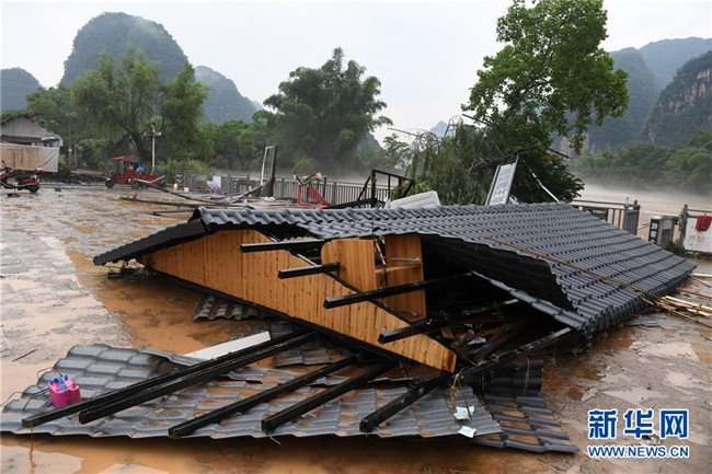 這是廣西陽(yáng)朔縣遇龍河邊被洪水損毀的旅游設(shè)施(6月8日攝)。新華社記者 陸波岸 攝