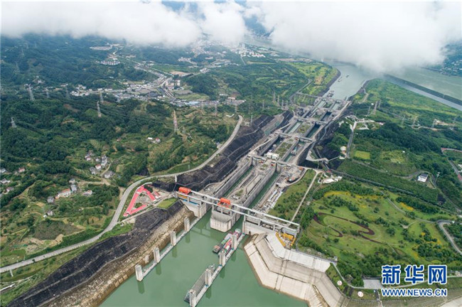 這是6月18日在大壩上游拍攝的穩(wěn)健運行的三峽船閘(無人機照片).新華社發(fā)(王罡 攝)