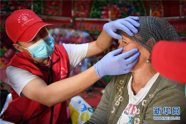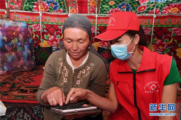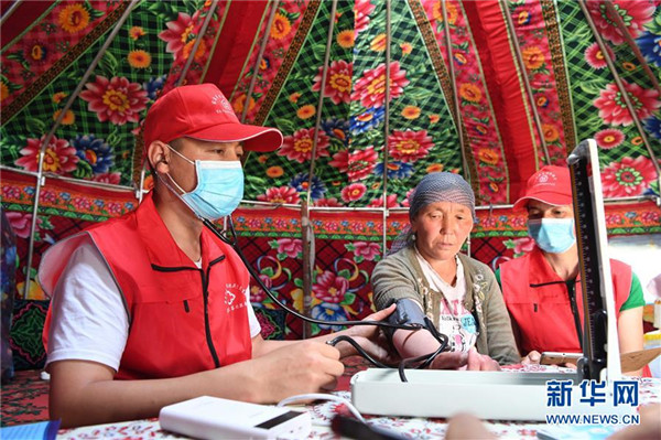 6月20日,新疆阿勒泰地區(qū)布爾津縣也格孜托別鄉(xiāng)克孜勒托蓋村村醫(yī)來到布爾津縣黑流灘草原給牧民巴合提古麗·塔拉甫汗檢查身體。圍繞實現(xiàn)人人享有基本醫(yī)療衛(wèi)生服務(wù)目標,2016年起,新疆布爾津縣開展家庭醫(yī)生簽約服務(wù)工作。該縣組建家庭醫(yī)生簽約團隊65個,團隊醫(yī)務(wù)人員233名,通過手機APP、基本公衛(wèi)系統(tǒng)與全縣建檔立卡貧困戶進行電子化簽約,提升村醫(yī)隨訪的工作效率和質(zhì)量。截至目前,已完成簽約42936人,履約40043人。新華社記者沙達提攝