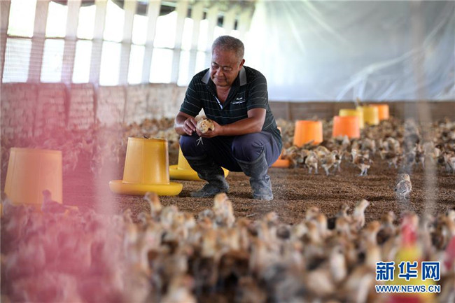 6月26日,在肥西縣花崗鎮(zhèn)楊灣村的土雞養(yǎng)殖基地里,黃榮春在雞棚里忙碌。新華社記者 劉軍喜 攝
