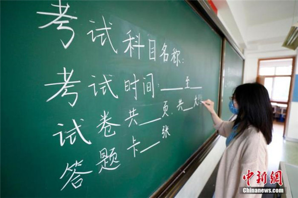 7月3日,北京十二中老師布置考場。該校共設(shè)標(biāo)準(zhǔn)考場33間,備用考場3間,將有660名考生在此考試。 中新社記者 富田 攝