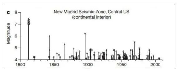 例如,在1811-1812年間,位于北美板塊內(nèi)部的美國密蘇里州的紐馬德里地區(qū)曾發(fā)生過三次7.0-7.4級地震。盡管地震已經(jīng)過去兩百多年,但一直到2000年為止,該地區(qū)的小震依然很活躍,研究人員認為這些小震是大地震的余震。