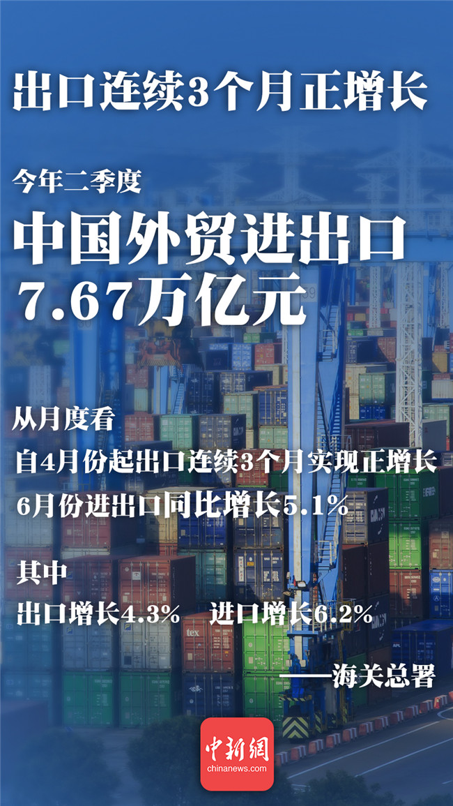出口連續(xù)3個(gè)月正增長(zhǎng)。海關(guān)總署數(shù)據(jù)顯示,上半年外貿(mào)進(jìn)出口整體表現(xiàn)好于預(yù)期。6月份當(dāng)月進(jìn)出口實(shí)現(xiàn)年內(nèi)首次雙雙正增長(zhǎng)。出口自4月份起連續(xù)三個(gè)月保持同比正增長(zhǎng)。