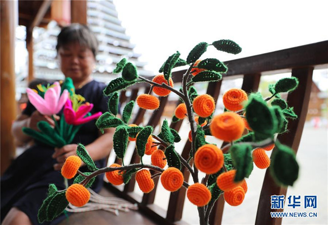 7月18日,在貴州省銅仁市玉屏侗族自治縣田坪鎮(zhèn)侗鄉(xiāng)風情園內(nèi),易地扶貧搬遷群眾在加工手工藝品。新華社發(fā)(胡攀學 攝)