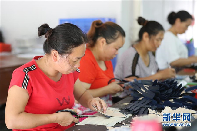 7月18日,在貴州省銅仁市玉屏侗族自治縣田坪鎮(zhèn)侗鄉(xiāng)風情園內(nèi),易地扶貧搬遷群眾在制鞋。新華社發(fā)(胡攀學 攝)