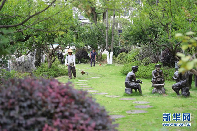 7月18日,在貴州省銅仁市玉屏侗族自治縣田坪鎮(zhèn)侗鄉(xiāng)風情園內(nèi),易地扶貧搬遷群眾在整理景區(qū)草坪。新華社發(fā)(胡攀學 攝)