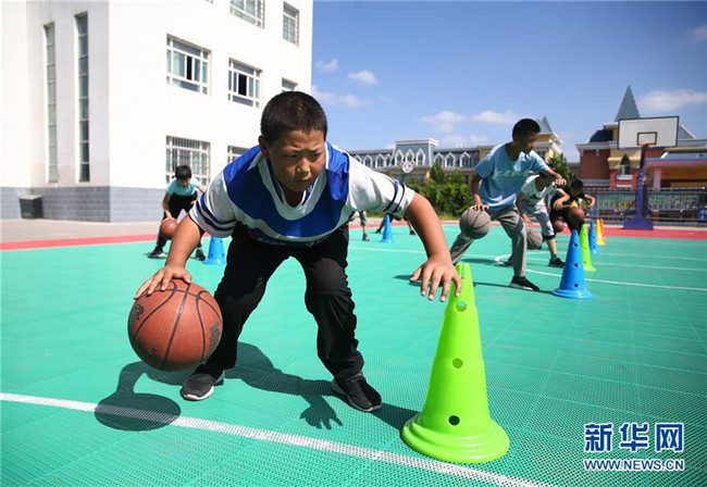 7月22日,學(xué)生在石嘴山市大武口區(qū)青少年學(xué)生校外活動中心籃球場上練習(xí)運(yùn)球。 新華社記者 賈浩成 攝