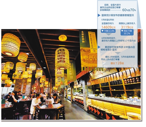 相比北京,全國其他地區(qū)餐飲行業(yè)回暖跡象要明顯得多。國家統(tǒng)計局發(fā)布的最新數(shù)據(jù)顯示,1月份至6月份,全國餐飲收入14609億元,下降32.8%;限額以上餐飲收入3119億元,同比下降30.2%。6月份有所回升,餐飲收入降幅比上月收窄3.7個百分點,大部分店面已恢復(fù)到疫情前的六七成水平,特別是端午節(jié)小長假以后,一些店鋪人氣頗高。