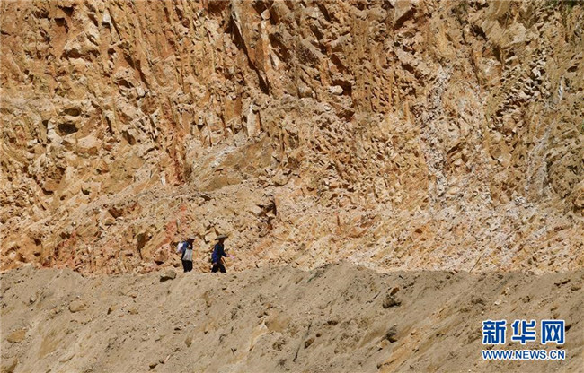 在烏英苗寨,70歲的老黨員梁安合(左)給正在產(chǎn)業(yè)路施工現(xiàn)場的村民送飯(7月30日攝)。 新華社記者 黃孝邦 攝