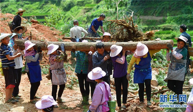 在烏英苗寨,村民們在山上扛木頭,為產(chǎn)業(yè)路施工做準(zhǔn)備(7月30日攝)。 新華社記者 黃孝邦 攝