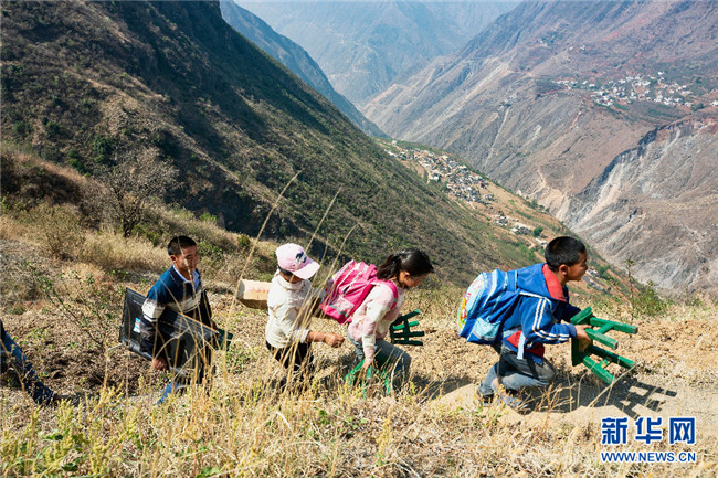 李本艷姐弟倆從家門(mén)口沿著崎嶇的山路走到學(xué)校,要近兩個(gè)小時(shí),每走一步,腳下都是數(shù)百米高的懸崖。搬家后,姐弟倆帶著書(shū)包和小板凳離開(kāi)(攝于4月1日)。新華網(wǎng)發(fā)(鮑禹 攝)