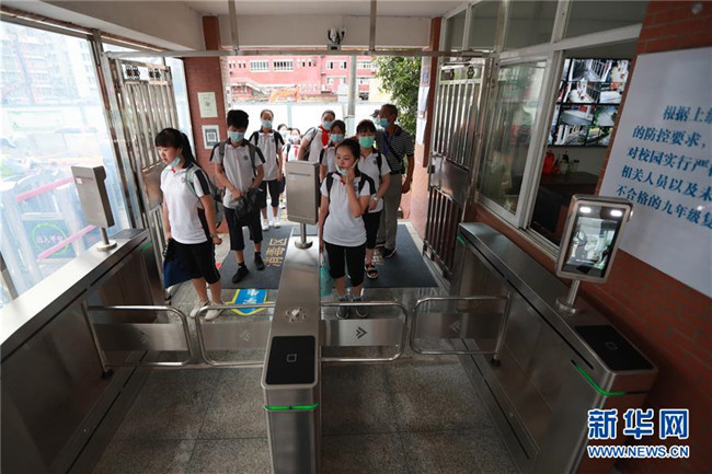 8月10日,在位于武漢的湖北省水果湖一中,初一、初二年級(jí)學(xué)生通過(guò)測(cè)溫通道入校。