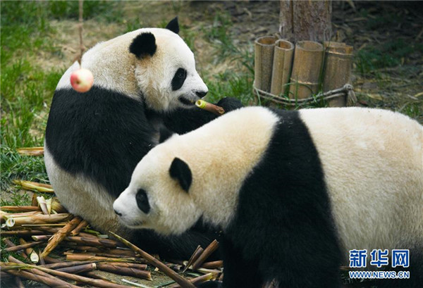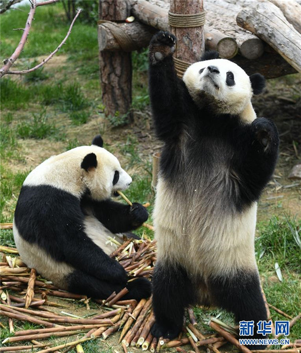 8月16日,大熊貓“奇果”(左)和“園滿”在西寧熊貓館內(nèi)玩耍。青海省西寧熊貓館的四只大熊貓已經(jīng)在西寧生活了一年多,在工作人員的悉心照顧下,已經(jīng)適應(yīng)了青藏高原的氣候,身體各項指標(biāo)正常。新華社記者薛玉斌攝