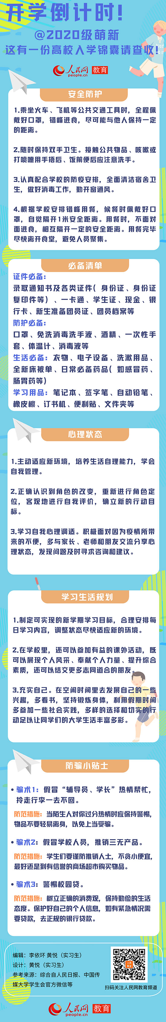 當前,全國多地高校已經(jīng)陸續(xù)公布秋季開學時間,大學校園即將迎來“萌新”報到。人民網(wǎng)教育頻道特別梳理了一份入學錦囊,請即將步入新階段的學子們查收,元氣滿滿開啟大學校園生活。(李依環(huán) 實習生黃悅)