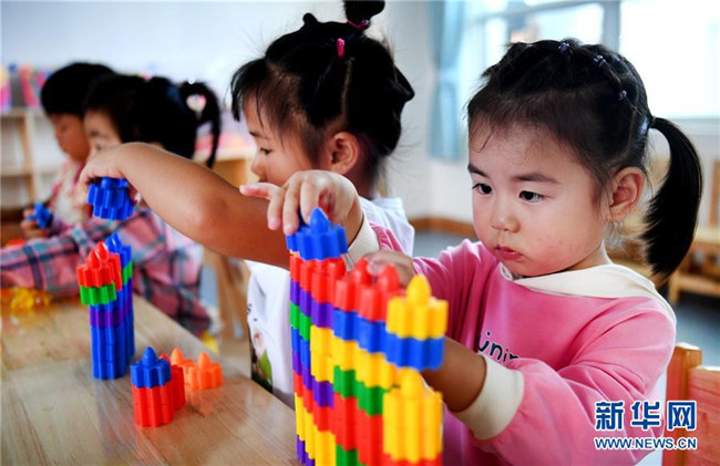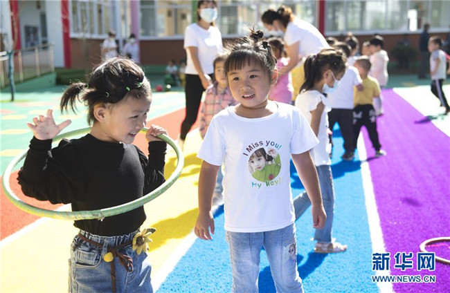 8月25日,在新落成的靈口鎮(zhèn)中心幼兒園里,即將入園的孩子們在做游戲。新華社記者陶明攝